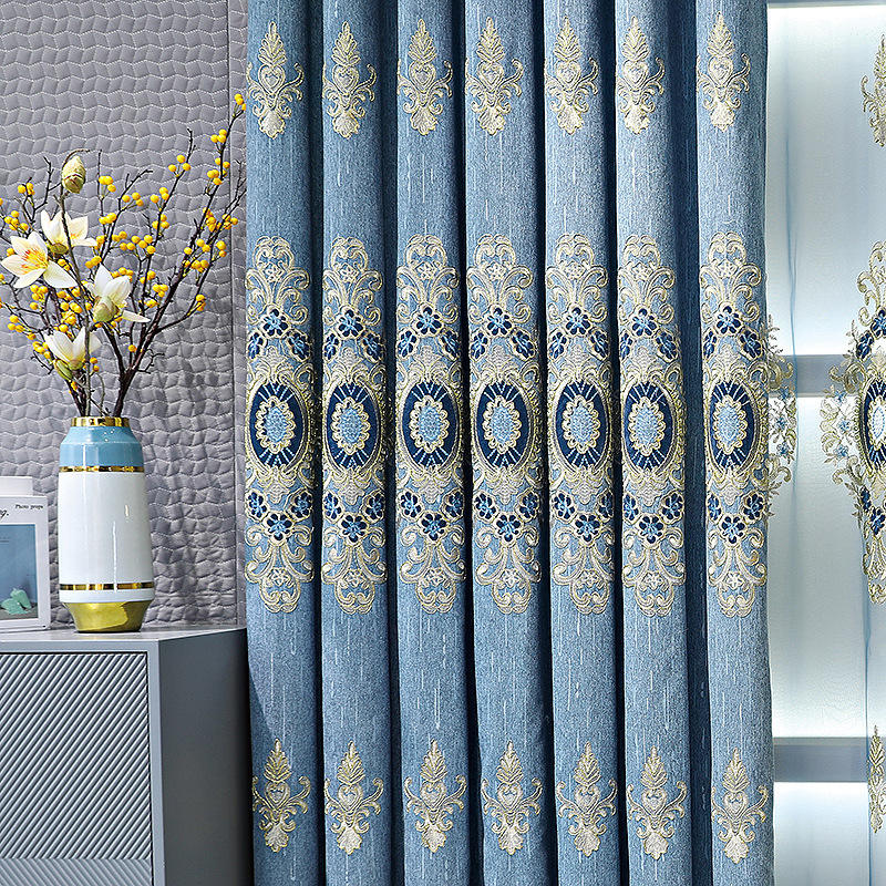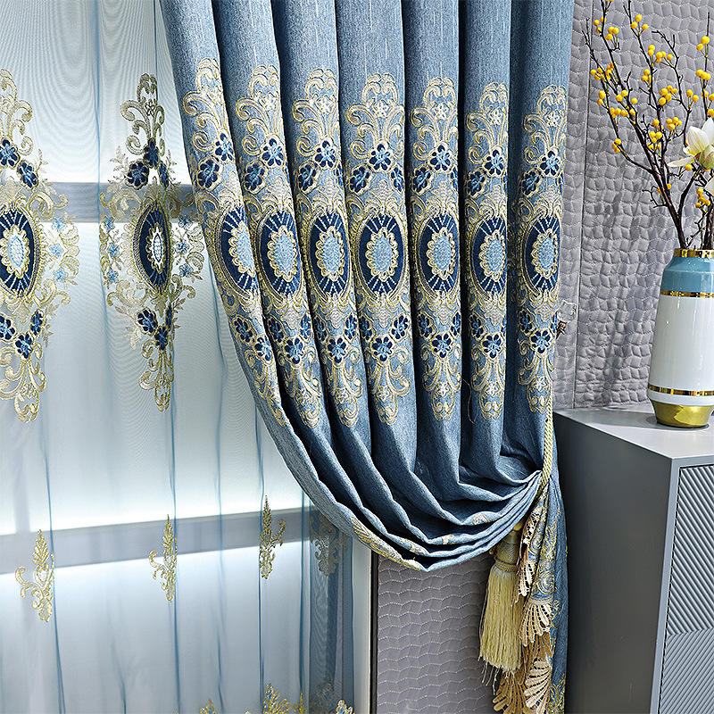 ESBC-045 | ม่านจีบลายปักยุโรมหรู สีฟ้าเข้ม พร้อมผ้าโปร่งเข้าชุด
