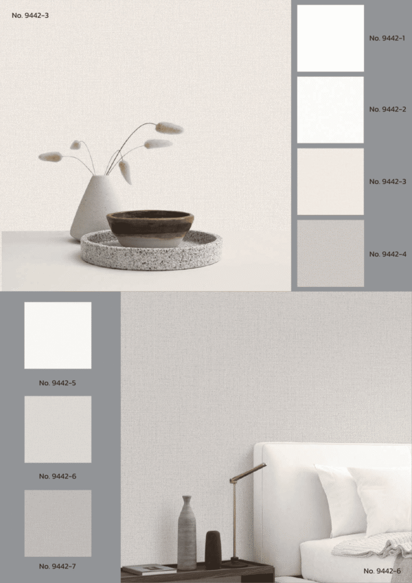 วอลล์เปเปอร์ J-PLATINUM รุ่น 9442 โทนสีครีม เทา และขาว ให้ความรู้สึกอบอุ่น หรูหรา และทันสมัย เหมาะสำหรับห้องนอน ห้องนั่งเล่น หรือโซนพักผ่อนที่ต้องการความสงบและมีรสนิยม