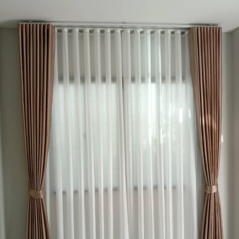 LC-001 ม่านลอนสองชั้น ผสมผสานม่านทึบครีมน้ำตาลกับม่านโปร่ง ให้บรรยากาศอบอุ่น หรูหรา พร้อมฟังก์ชันใช้งานครบถ้วน