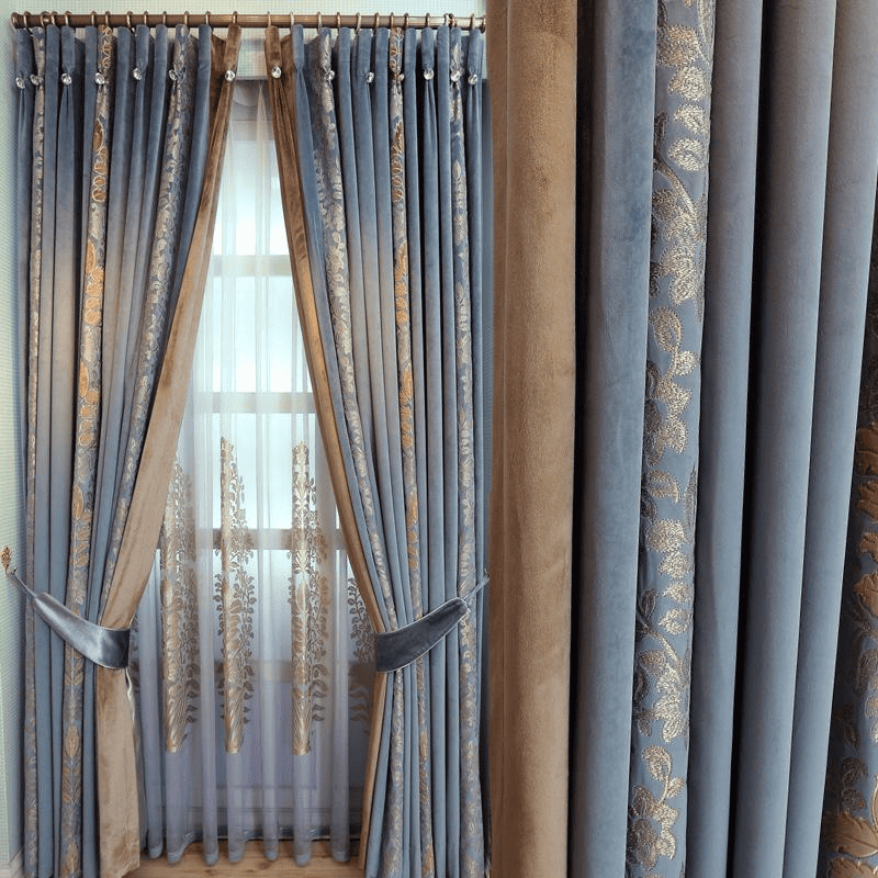 LC-010 | ผ้าม่านกำมะหยี่ปักลายสุดหรู สีน้ำเงิน-น้ำตาลทอง พร้อมผ้าโปร่งลายปักสีทอง ตัดเย็บตามขนาดหน้าต่างได้ เหมาะสำหรับห้องนอนหรือห้องรับแขกสไตล์คลาสสิก