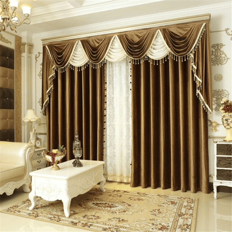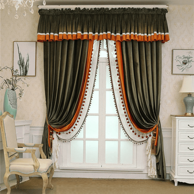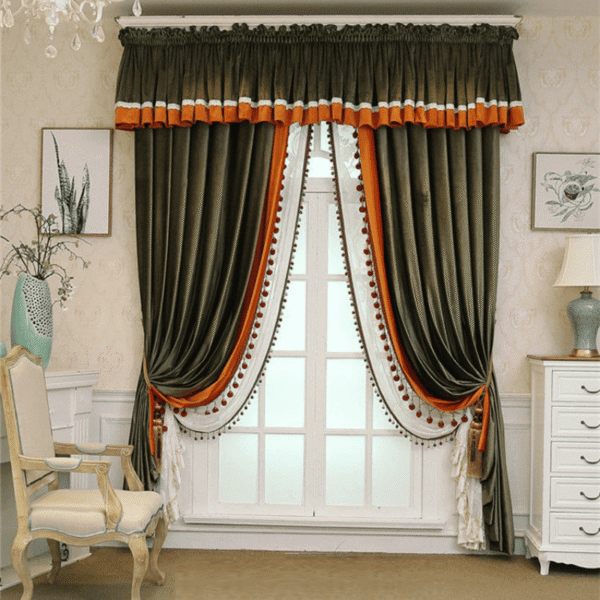 ผ้าม่านสไตล์หลุยส์ LC-017 หรูหราด้วยระบายสองชั้นและผ้ากำมะหยี่ตกแต่งชายครุย พร้อมม่านโปร่งลายลูกไม้ สามารถสั่งตัดตามขนาดพื้นที่ ใช้ได้ทั้งบ้าน คอนโด และโครงการ