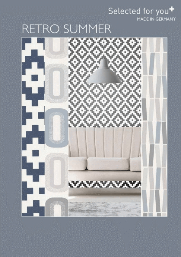 Retro Summer นำเสนอความสวยงามที่ผสานกลิ่นอายเรโทรกับลวดลายโมเดิร์นอย่างลงตัว ด้วยดีไซน์กราฟิกสุดคลาสสิก โทนสีเทา ขาว น้ำเงิน และพาสเทล ที่ให้ความรู้สึกสดใสและร่วมสมัย เหมาะสำหรับตกแต่งห้องนั่งเล่น ห้องรับแขก หรือร้านค้าที่ต้องการความโดดเด่นไม่เหมือนใคร ผลิตจากวัสดุไวนิลคุณภาพสูงจากเยอรมนี ให้ผิวสัมผัสที่ทนทานและทำความสะอาดง่าย